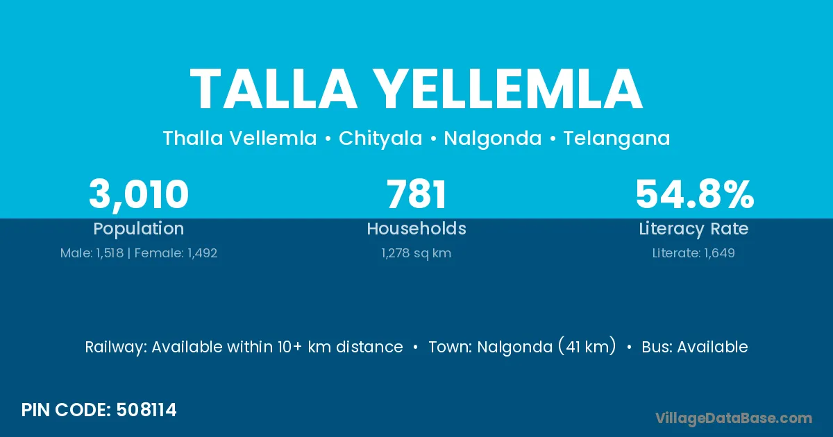Nalgonda (41 km) is the nearest town to Talla Yellemla village for major economic activities and is located approximately 41 km away.