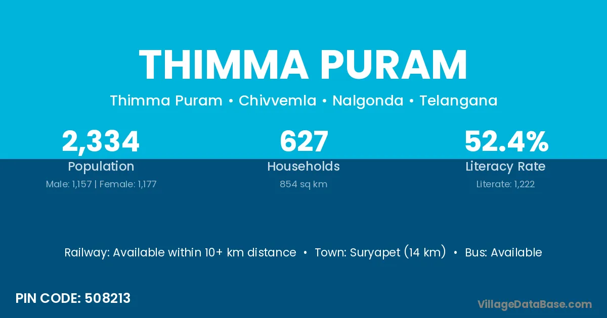 Suryapet (14 km) is the nearest town to Thimma Puram village for major economic activities and is located approximately 14 km away.
