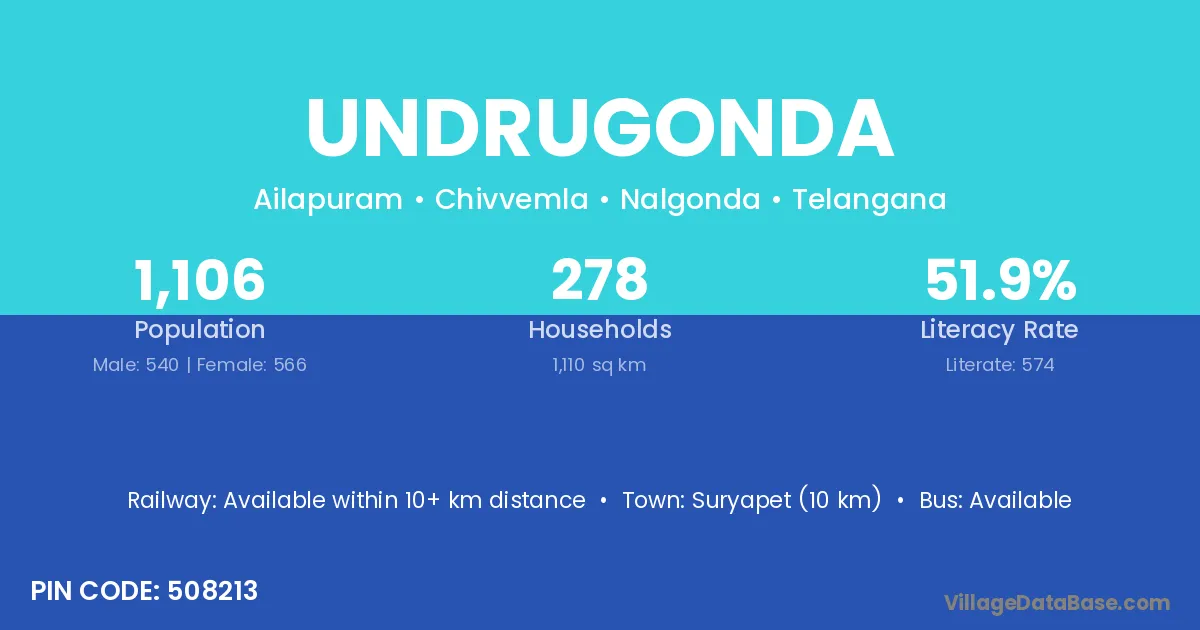 Suryapet (10 km) is the nearest town to Undrugonda village for major economic activities and is located approximately 10 km away.