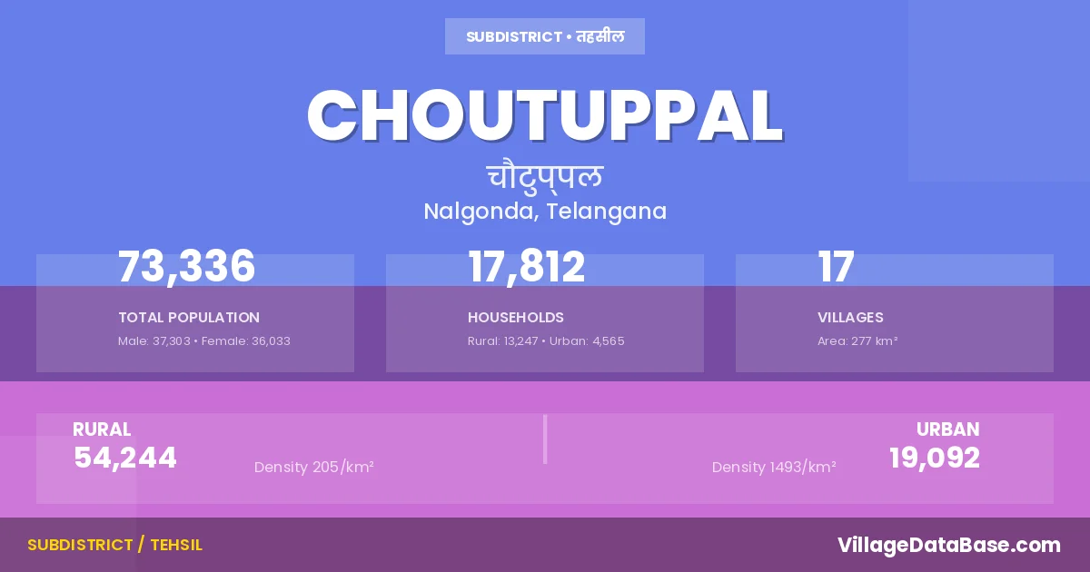 According to the 2011 census The total area of Choutuppal Mandal is 277 km², with a population of 73336 people. The population density is 265 inhabitants per square kilometre, and there are approximately 17812 houses in the sub district.