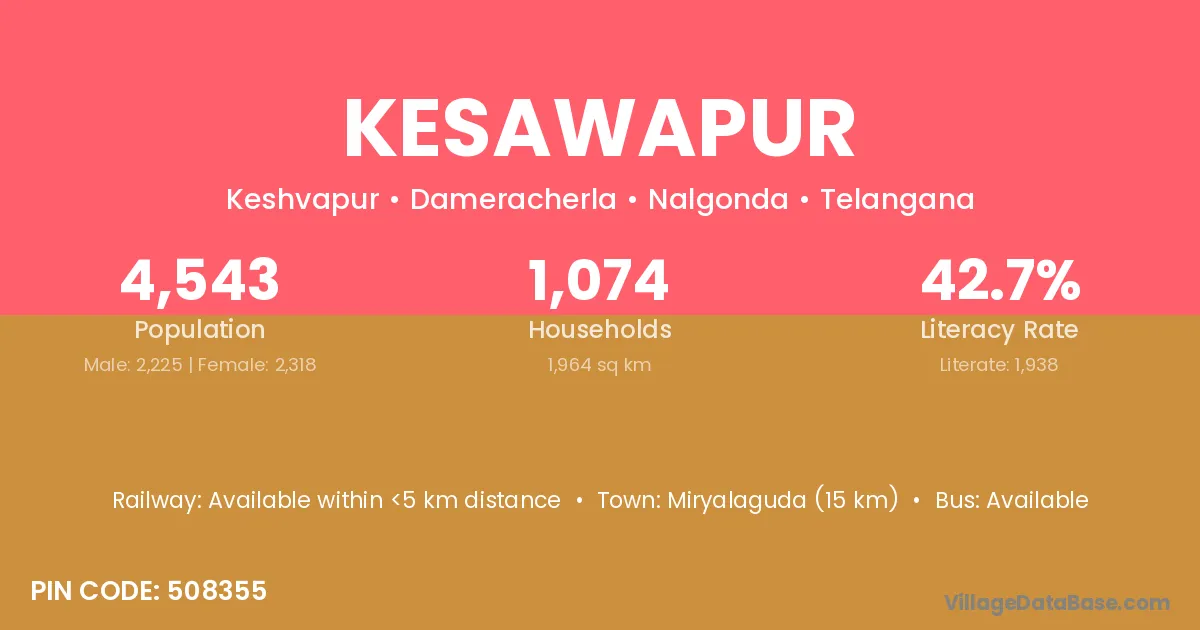 Miryalaguda (15 km) is the nearest town to Kesawapur village for major economic activities and is located approximately 15 km away.