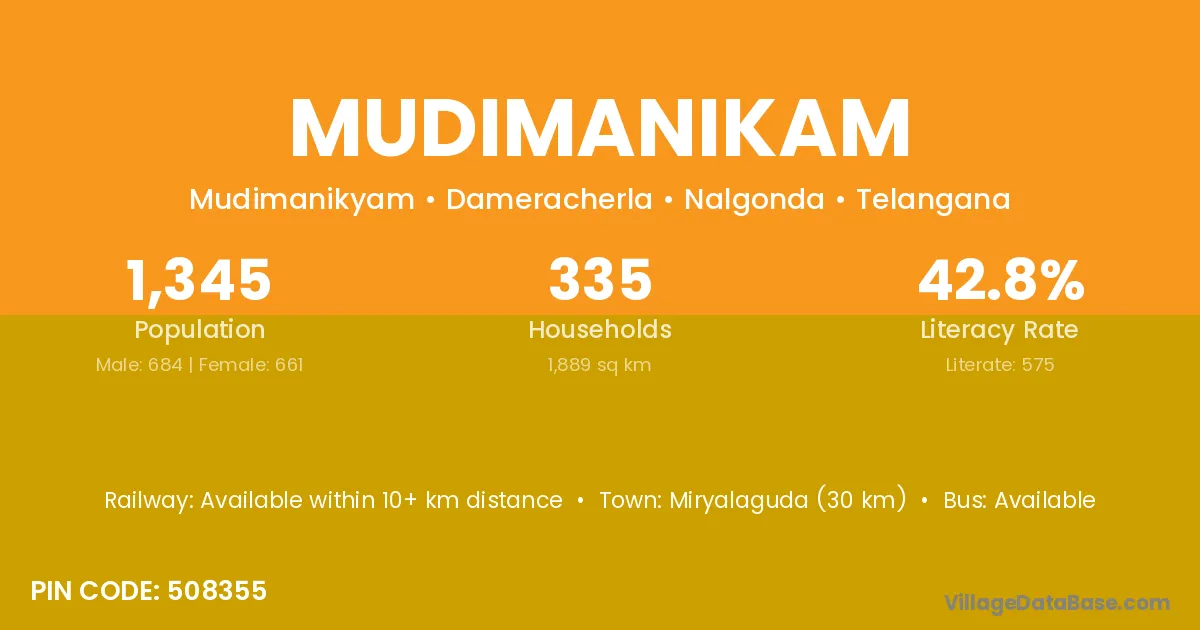 Miryalaguda (30 km) is the nearest town to Mudimanikam village for major economic activities and is located approximately 30 km away.