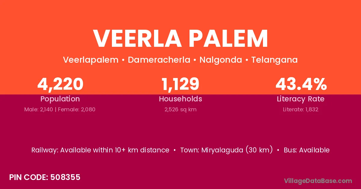 Miryalaguda (30 km) is the nearest town to Veerla Palem village for major economic activities and is located approximately 30 km away.