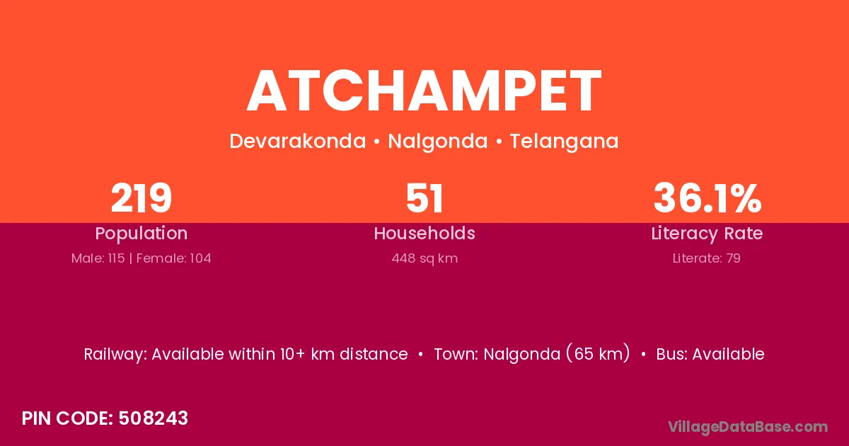 Nalgonda (65 km) is the nearest town to Atchampet village for major economic activities and is located approximately 65 km away.