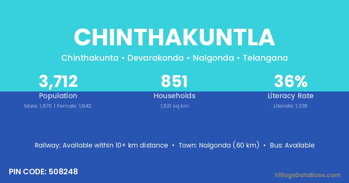 Nalgonda (60 km) is the nearest town to Chinthakuntla village for major economic activities and is located approximately 60 km away.