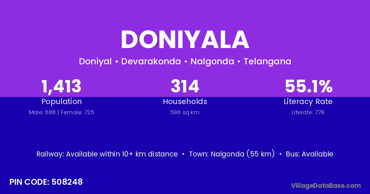 Nalgonda (55 km) is the nearest town to Doniyala village for major economic activities and is located approximately 55 km away.