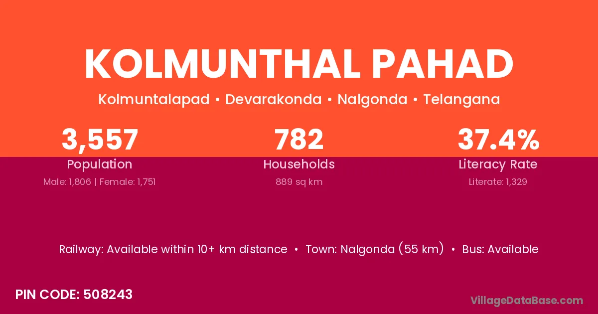 Nalgonda (55 km) is the nearest town to Kolmunthal Pahad village for major economic activities and is located approximately 55 km away.