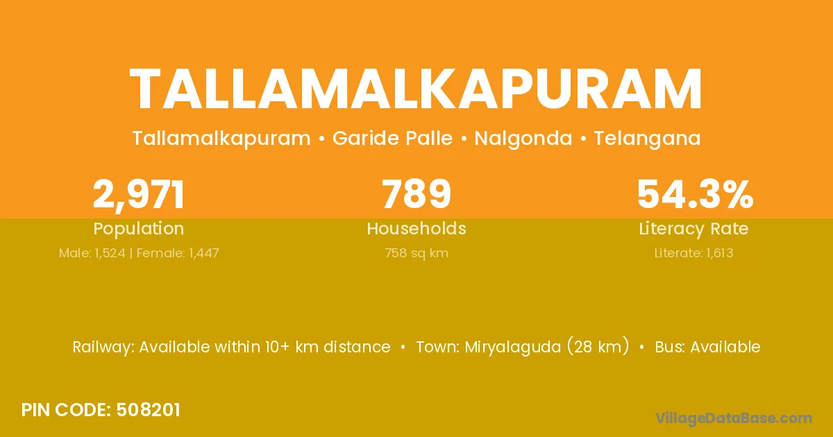 Miryalaguda (28 km) is the nearest town to Tallamalkapuram village for major economic activities and is located approximately 28 km away.