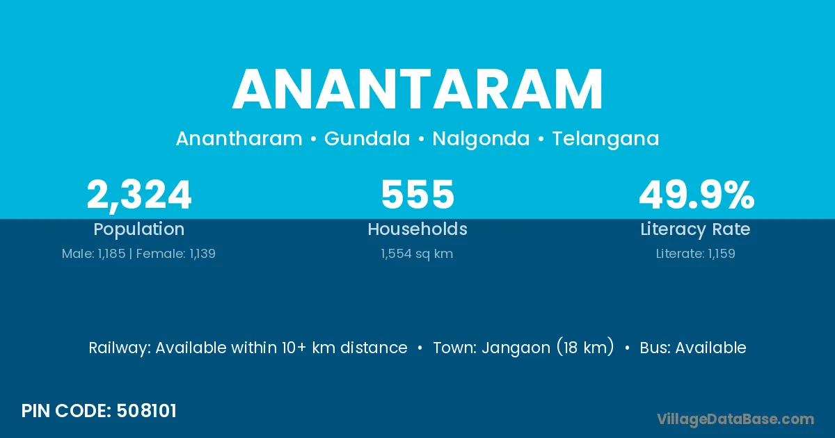 Jangaon (18 km) is the nearest town to Anantaram village for major economic activities and is located approximately 18 km away.