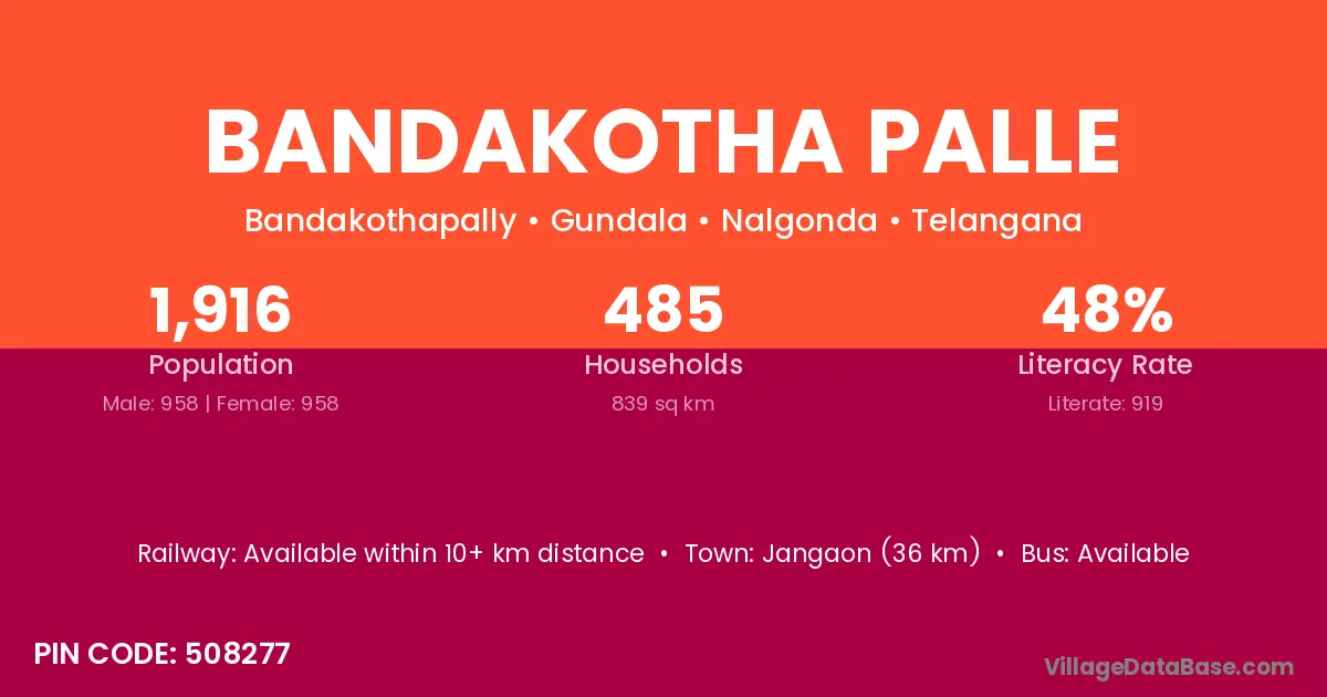 Jangaon (36 km) is the nearest town to Bandakotha Palle village for major economic activities and is located approximately 36 km away.