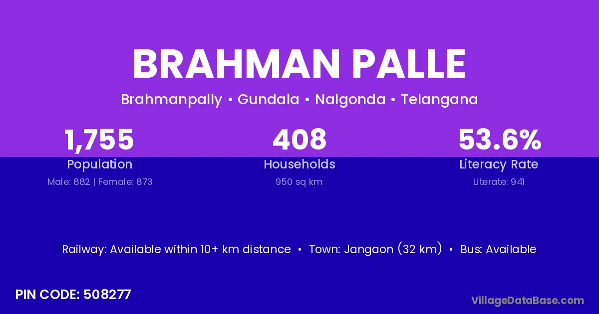 Brahman Palle village has a total population of 1,755 people, of which 882 are males and 873 are females.