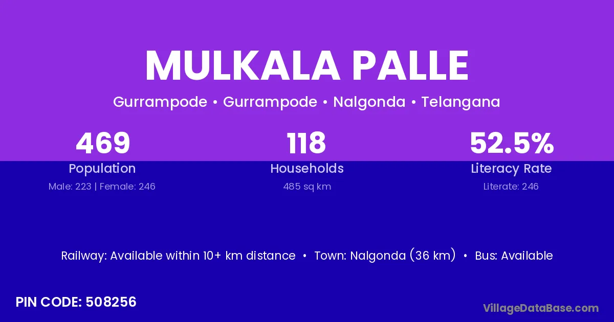 Nalgonda (36 km) is the nearest town to Mulkala Palle village for major economic activities and is located approximately 36 km away.