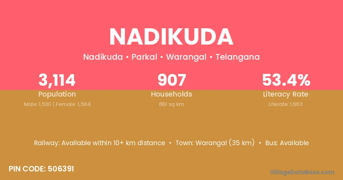 Nalgonda (42 km) is the nearest town to Nadikuda village for major economic activities and is located approximately 42 km away.