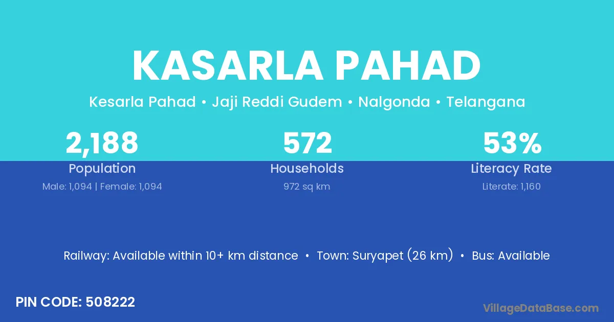 Suryapet (26 km) is the nearest town to Kasarla Pahad village for major economic activities and is located approximately 26 km away.