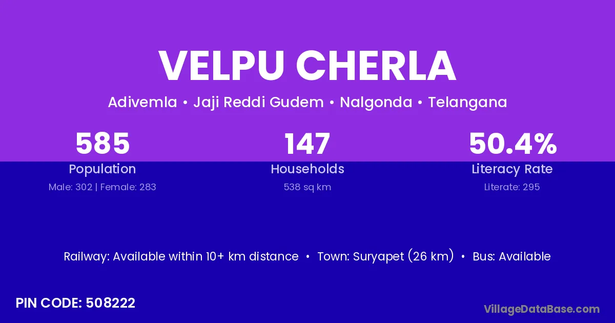 Suryapet (26 km) is the nearest town to Velpu Cherla village for major economic activities and is located approximately 26 km away.