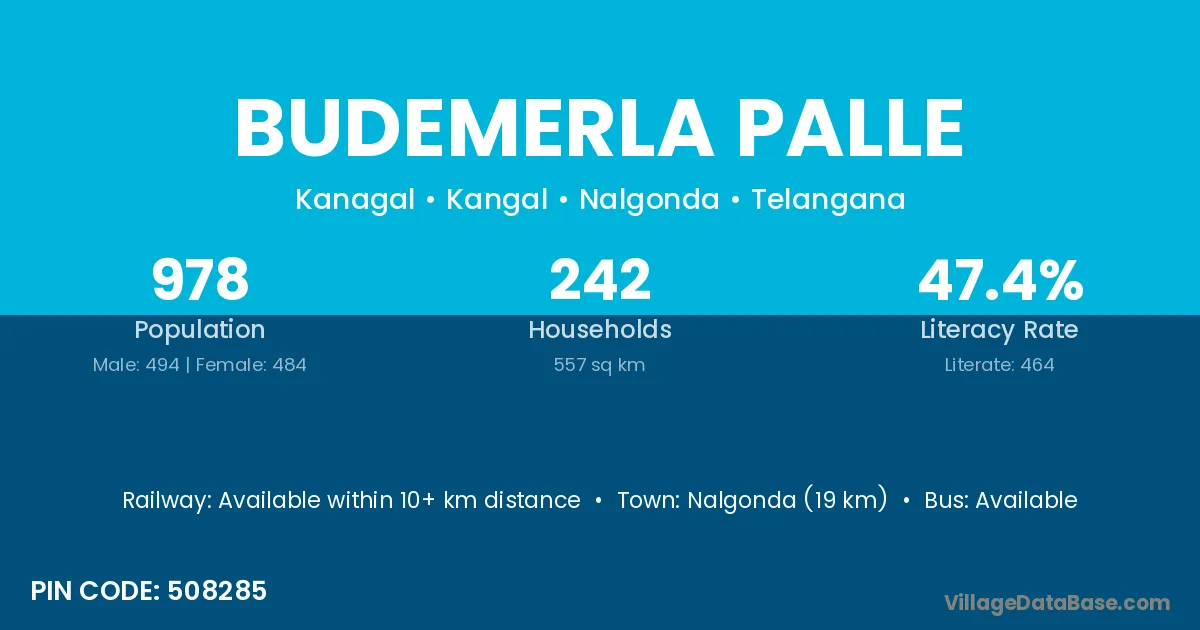 Nalgonda (19 km) is the nearest town to Budemerla Palle village for major economic activities and is located approximately 19 km away.
