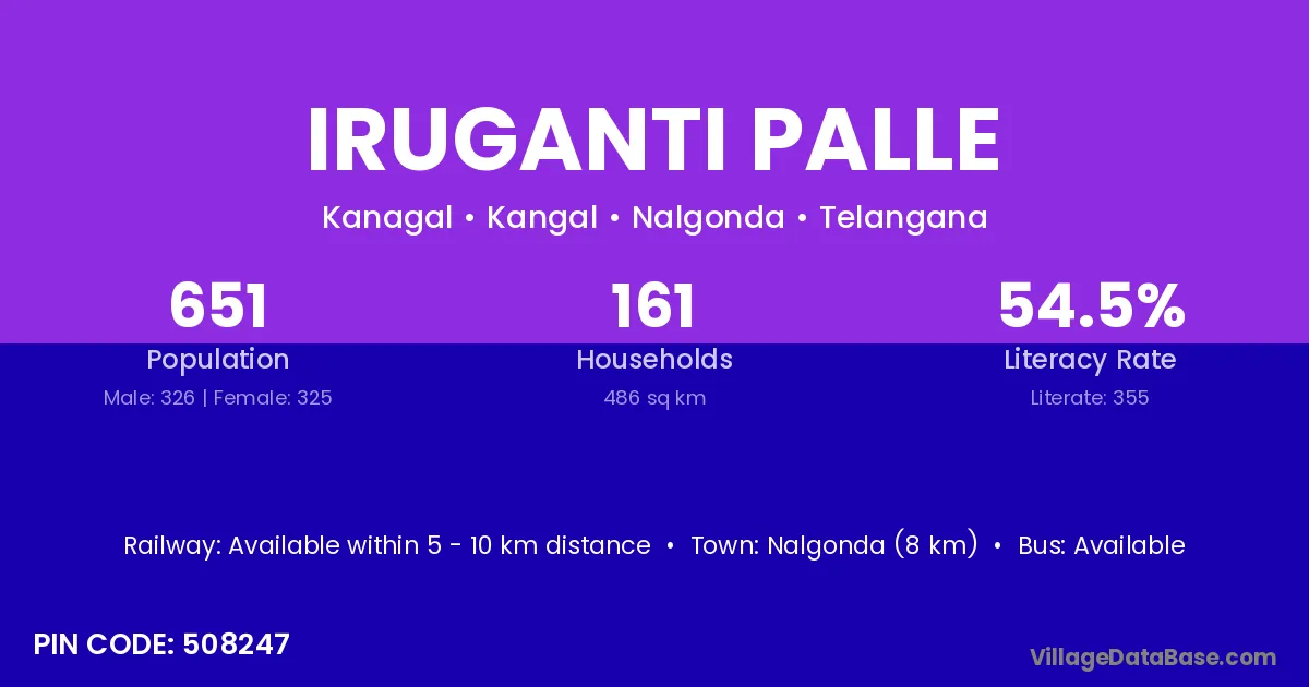 Nalgonda (8 km) is the nearest town to Iruganti Palle village for major economic activities and is located approximately 8 km away.