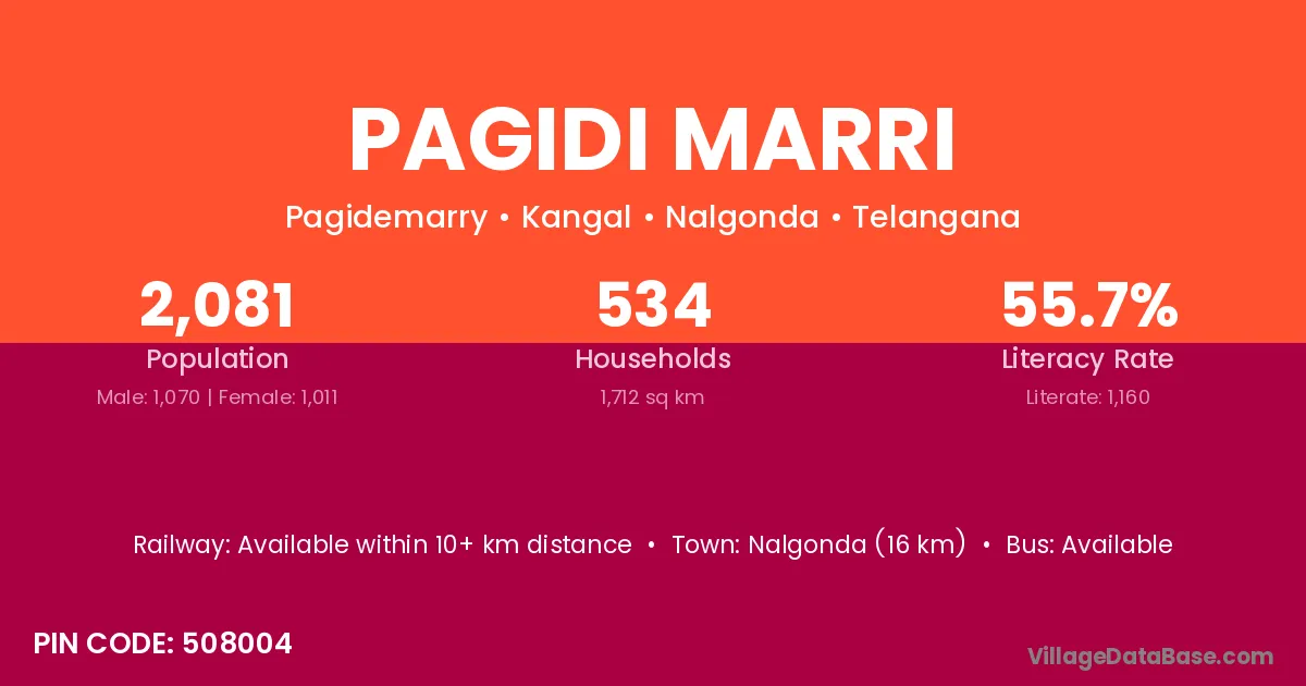 Nalgonda (16 km) is the nearest town to Pagidi Marri village for major economic activities and is located approximately 16 km away.