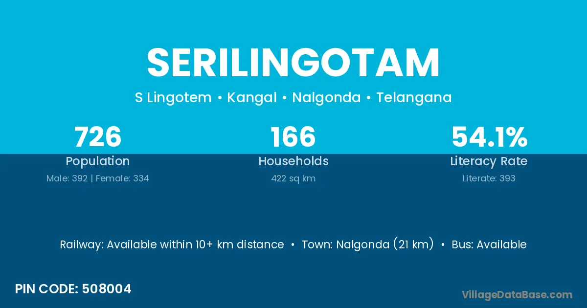 Nalgonda (21 km) is the nearest town to Serilingotam village for major economic activities and is located approximately 21 km away.