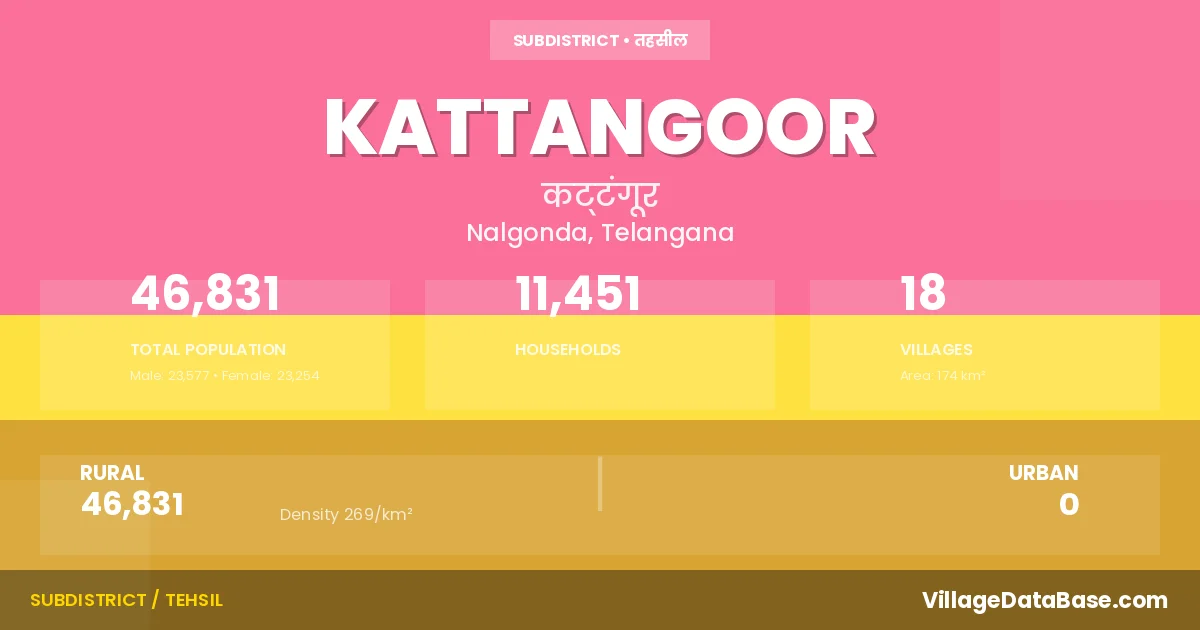 Kattangoor is a town and Mandal in the Nalgonda district of the Telangana. In India, a Mandal is a subdivision of a district responsible for the administration and revenue collection of a specific area within the district. Mandals play a crucial role in the local governance structure, contributing significantly to the development and administration of their communities.