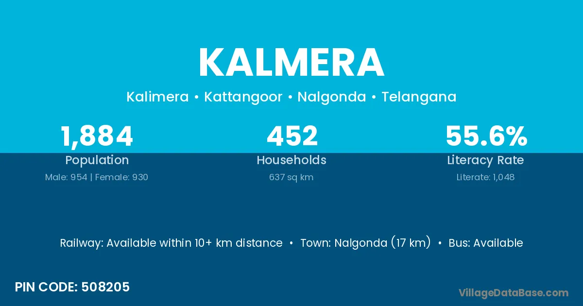 Nalgonda (17 km) is the nearest town to Kalmera village for major economic activities and is located approximately 17 km away.