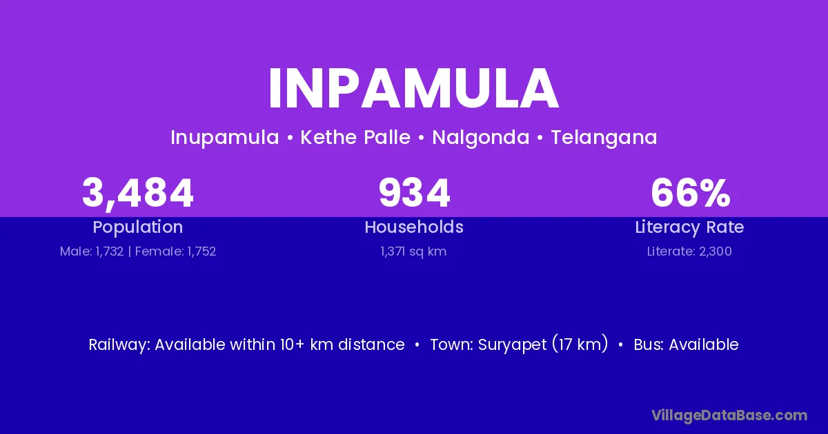 Suryapet (17 km) is the nearest town to Inpamula village for major economic activities and is located approximately 17 km away.