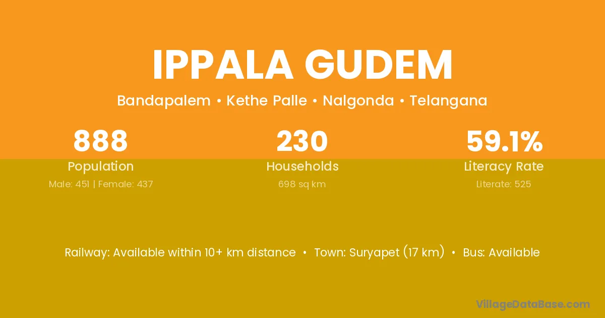 Suryapet (17 km) is the nearest town to Ippala Gudem village for major economic activities and is located approximately 17 km away.