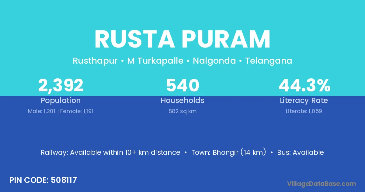 Bhongir (14 km) is the nearest town to Rusta Puram village for major economic activities and is located approximately 14 km away.