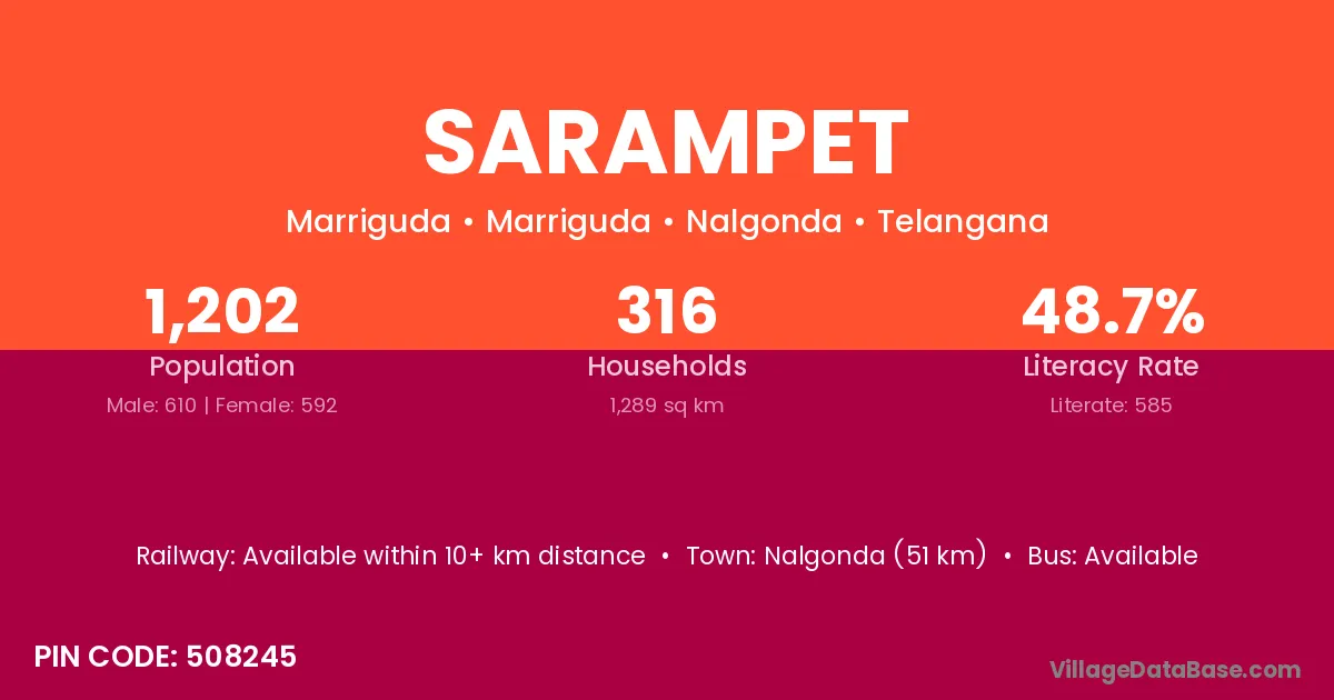 Nalgonda (51 km) is the nearest town to Sarampet village for major economic activities and is located approximately 51 km away.