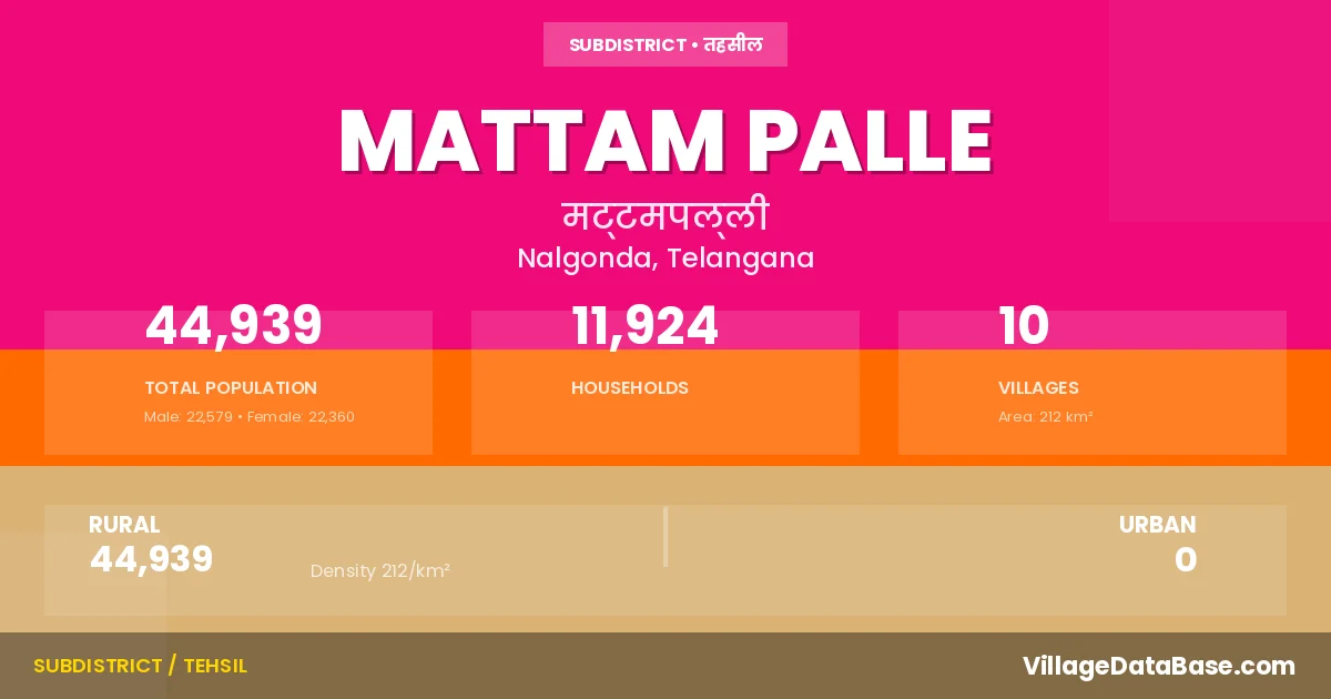 Mattam Palle is a town and Mandal in the Nalgonda district of the Telangana. In India, a Mandal is a subdivision of a district responsible for the administration and revenue collection of a specific area within the district. Mandals play a crucial role in the local governance structure, contributing significantly to the development and administration of their communities.