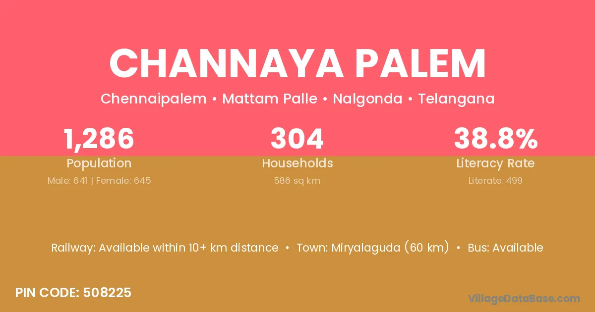 Miryalaguda (60 km) is the nearest town to Channaya Palem village for major economic activities and is located approximately 60 km away.