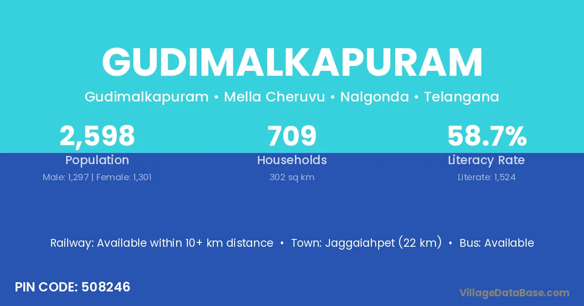Jaggaiahpet (22 km) is the nearest town to Gudimalkapuram village for major economic activities and is located approximately 22 km away.