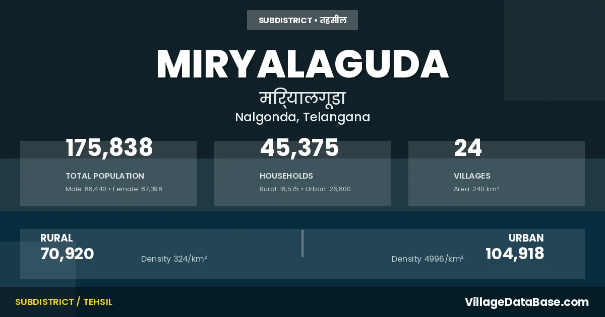 According to the 2011 census The total area of Miryalaguda Mandal is 240 km², with a population of 175838 people. The population density is 732 inhabitants per square kilometre, and there are approximately 45375 houses in the sub district.