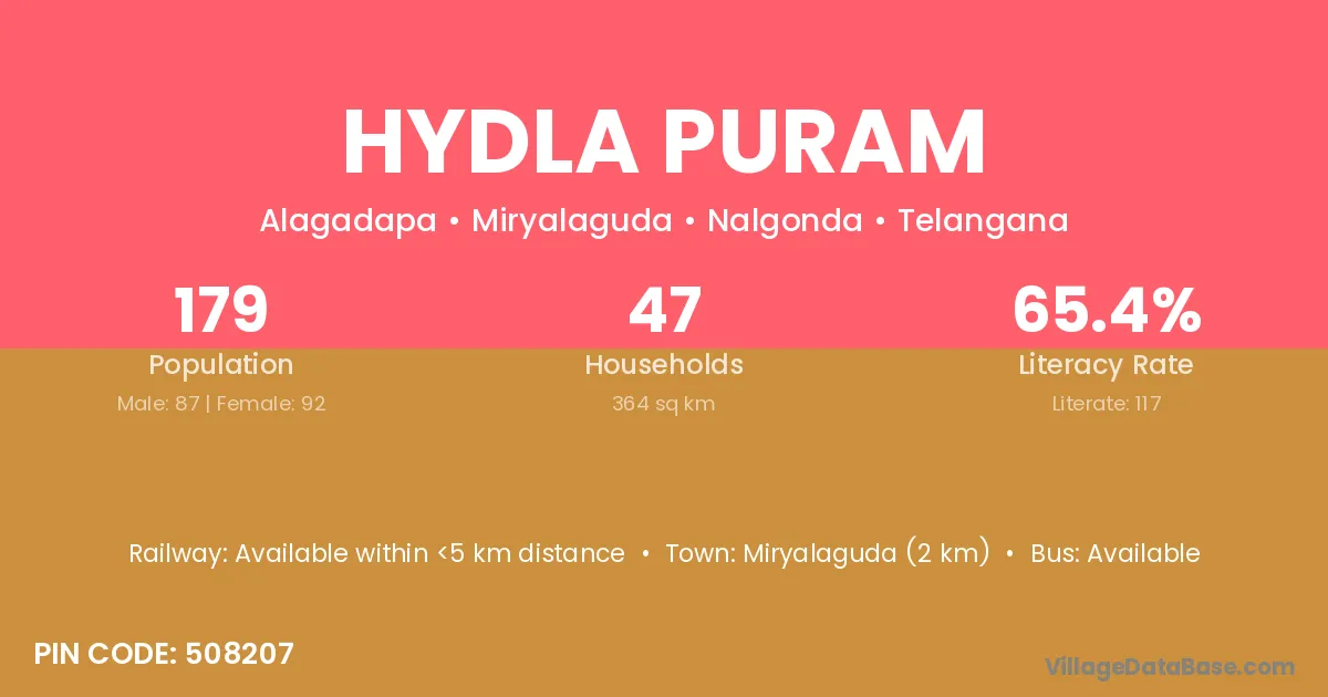 Miryalaguda (2 km) is the nearest town to Hydla Puram village for major economic activities and is located approximately 2 km away.