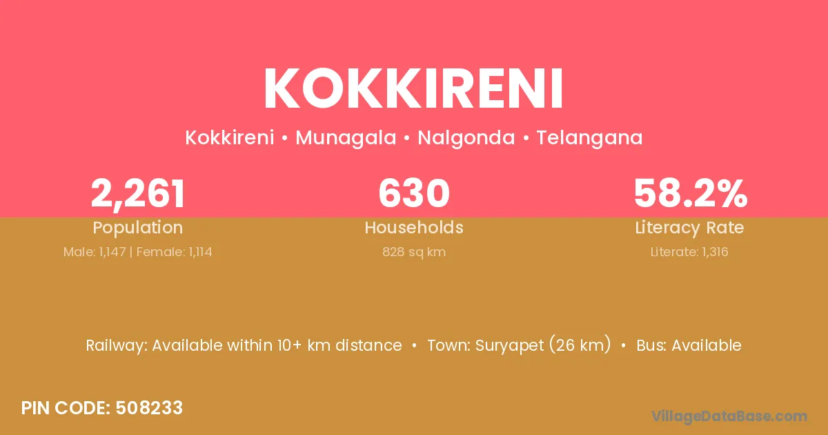 Suryapet (26 km) is the nearest town to Kokkireni village for major economic activities and is located approximately 26 km away.
