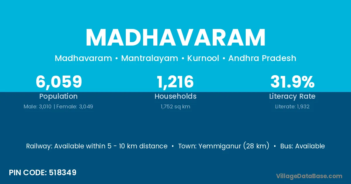 Madhavaram village has a total population of 1,904 people, of which 957 are males and 947 are females.