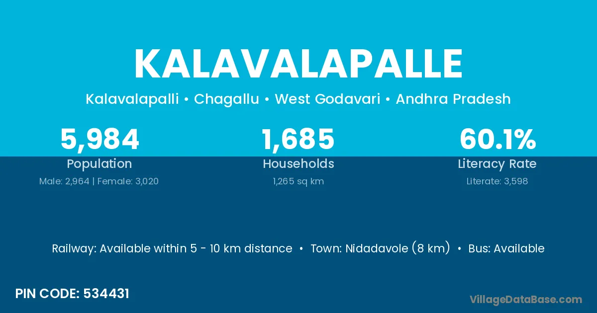 The literacy rate of Kalavalapalle village is 49.42%. Male literacy stands at 58.94% and female literacy at 39.54%.