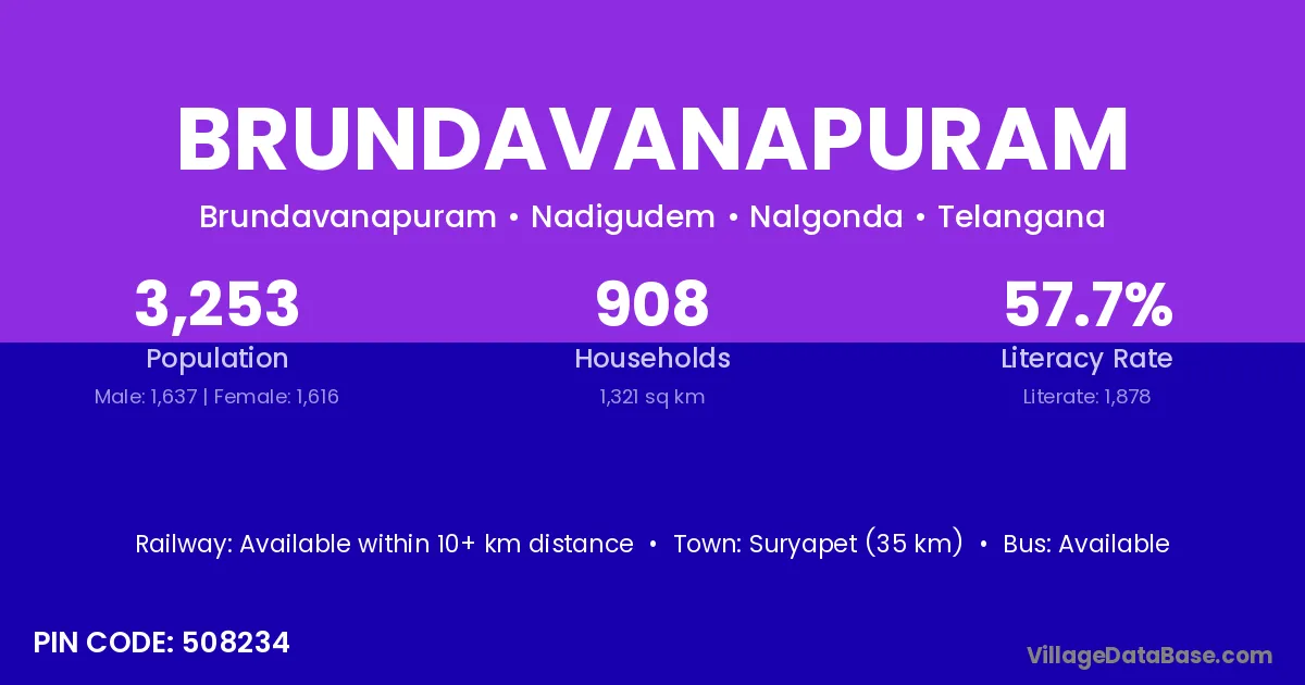 Suryapet (35 km) is the nearest town to Brundavanapuram village for major economic activities and is located approximately 35 km away.