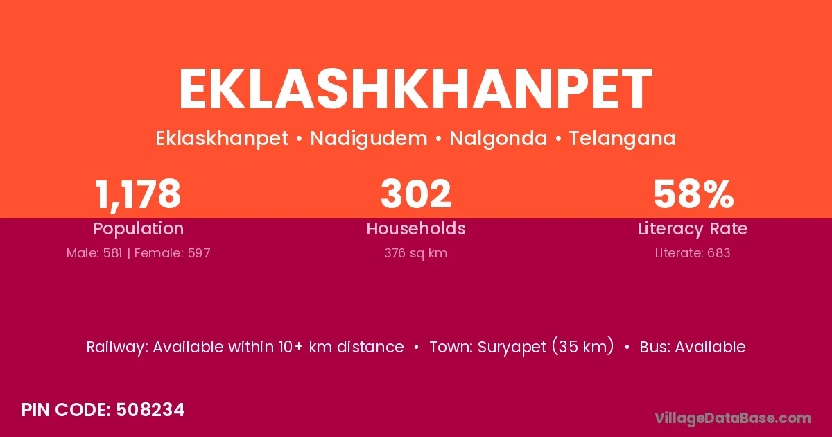 Suryapet (35 km) is the nearest town to Eklashkhanpet village for major economic activities and is located approximately 35 km away.