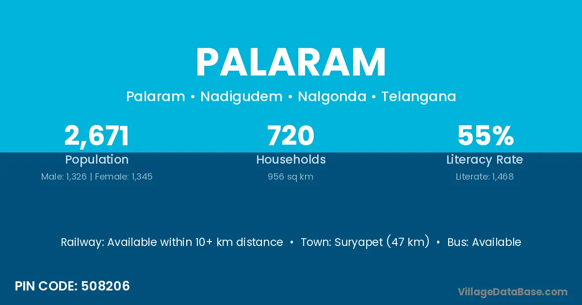 Suryapet (47 km) is the nearest town to Palaram village for major economic activities and is located approximately 47 km away.