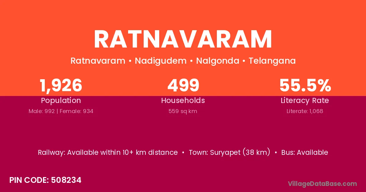 Suryapet (38 km) is the nearest town to Ratnavaram village for major economic activities and is located approximately 38 km away.