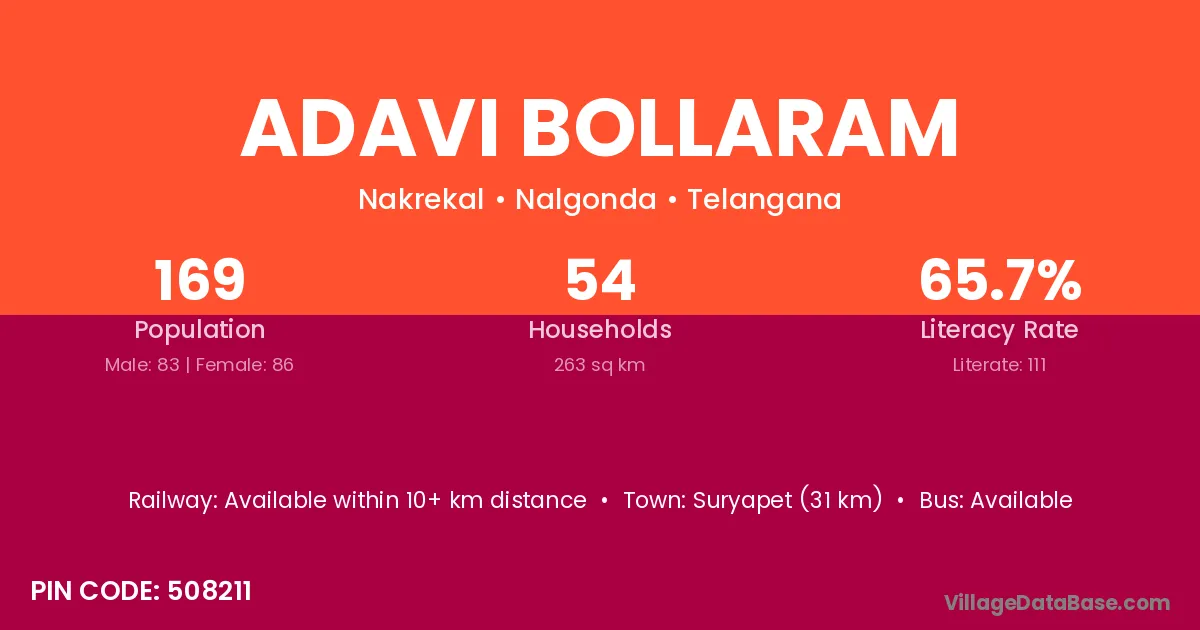 Suryapet (31 km) is the nearest town to Adavi Bollaram village for major economic activities and is located approximately 31 km away.