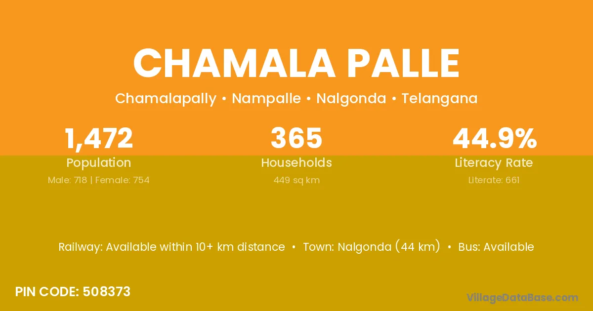 Nalgonda (44 km) is the nearest town to Chamala Palle village for major economic activities and is located approximately 44 km away.