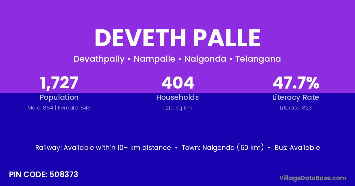 Nalgonda (60 km) is the nearest town to Deveth Palle village for major economic activities and is located approximately 60 km away.