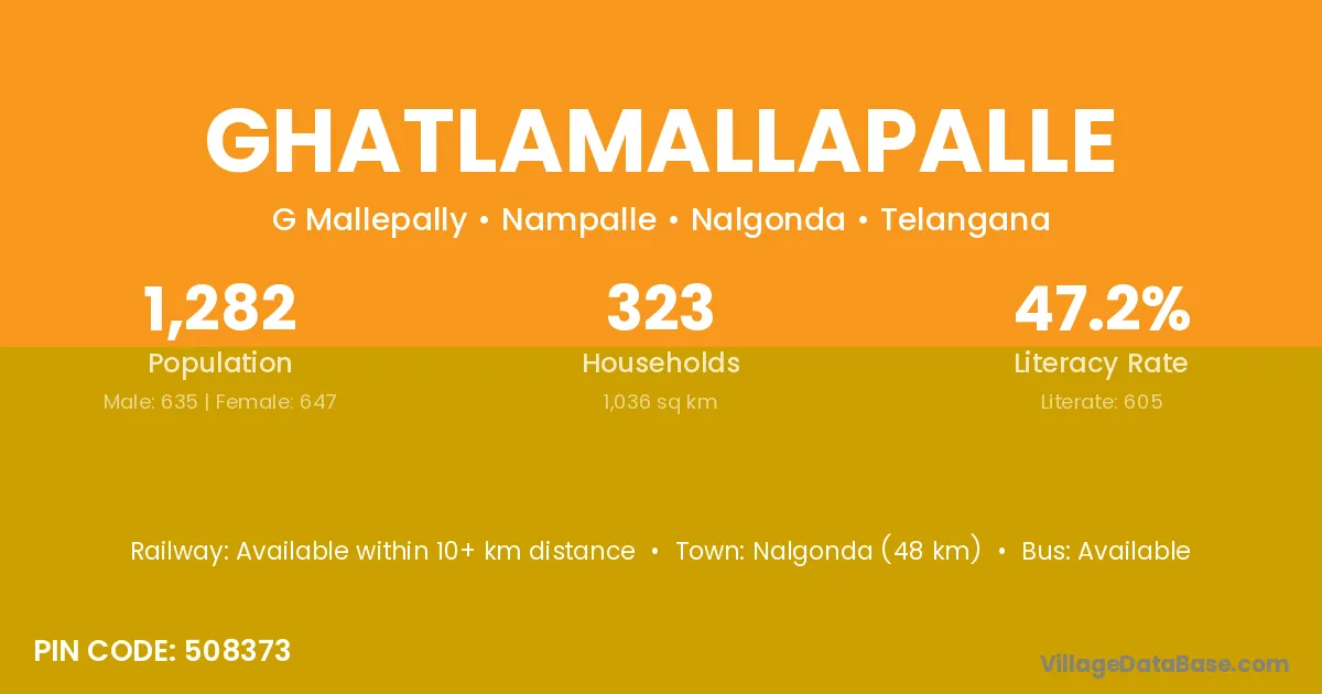 Nalgonda (48 km) is the nearest town to Ghatlamallapalle village for major economic activities and is located approximately 48 km away.