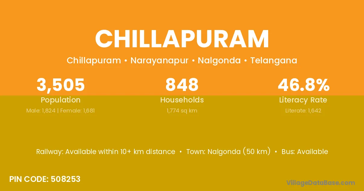 Nalgonda (50 km) is the nearest town to Chillapuram village for major economic activities and is located approximately 50 km away.