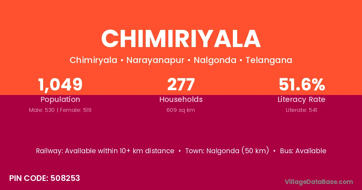 Chimiriyala village has a total population of 1,049 people, of which 530 are males and 519 are females.