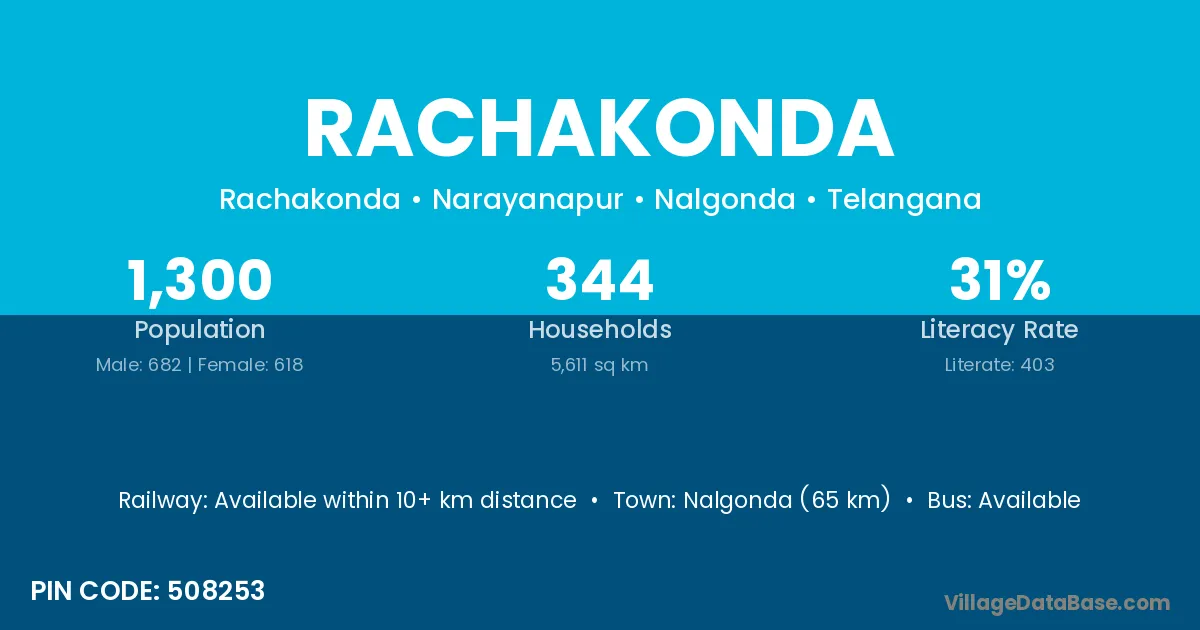 Nalgonda (65 km) is the nearest town to Rachakonda village for major economic activities and is located approximately 65 km away.