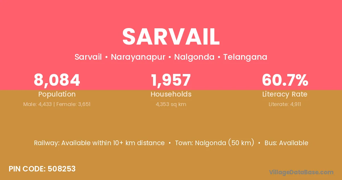 Nalgonda (50 km) is the nearest town to Sarvail village for major economic activities and is located approximately 50 km away.