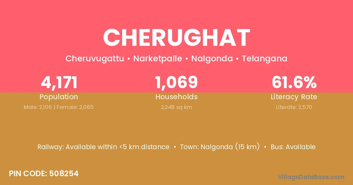 Nalgonda (15 km) is the nearest town to Cherughat village for major economic activities and is located approximately 15 km away.